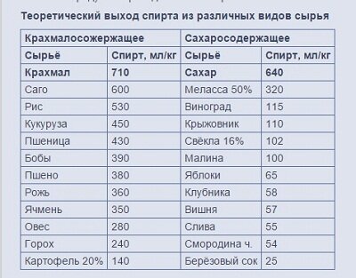 За основу я буду брать цену сырья за кг и возможный выход спирта по таблице. Всё сырьё, я буду сравнивать с сахаром, дабы понять, есть ли ему альтернатива.
