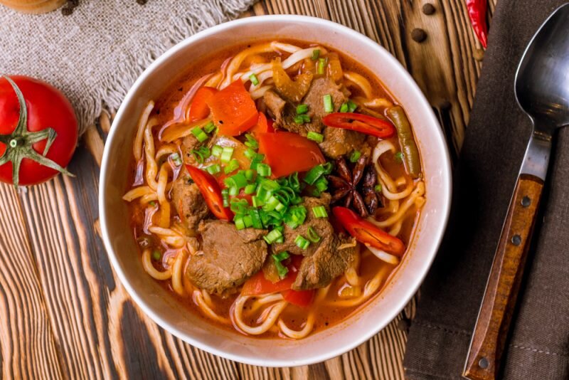 Лагман готовят в разных странах Средней Азии. Он состоит из двух частей – домашней, тонко раскатанной лапши и ваджи (тушеного мяса с овощами).