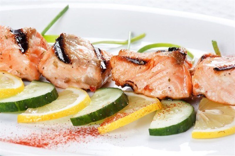 Замаринованные кусочки рыбы надеваем на деревянные палочки и выкладываем на предварительно смазанную маслом решётку.
