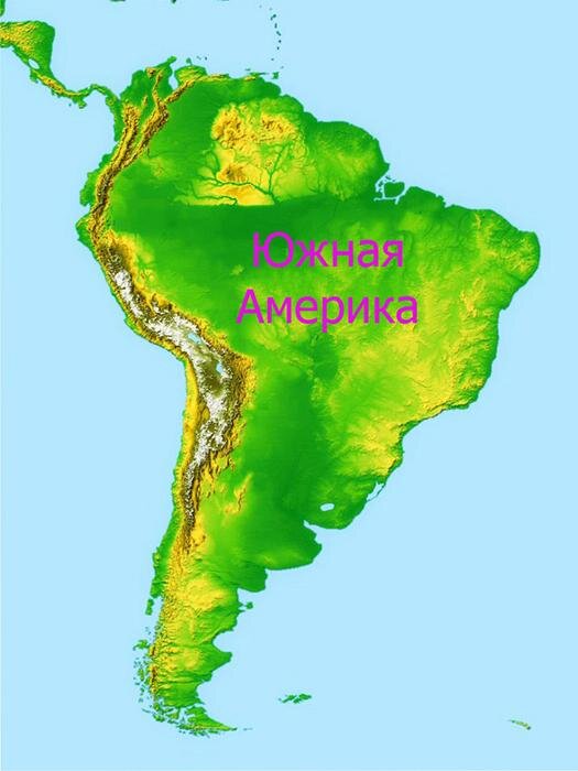 Западная часть материка состоит из горной системы Анд, протянувшихся через семь государств Южной Америки, а восточная из равнин. На Севере находится Гвианское плоскогорье длиной 1930 км и высотой – от 300 – 1000м.