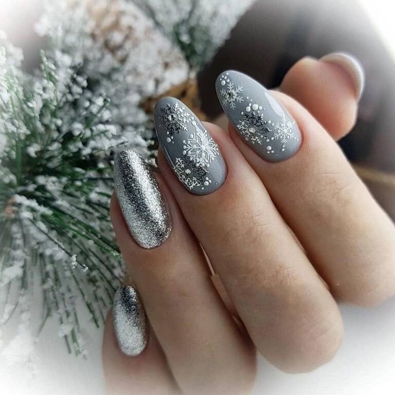 В целом, главный принцип новогоднего маникюра — никаких кислотных цветов и излишней вычурности, поэтому можно отдать предпочтение неустаревающей классике – френчу и нюдовым оттенкам. Придать ноготкам праздничного блеска помогут стразы и блестки: