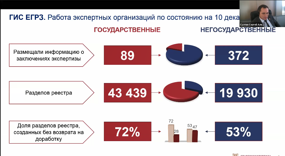 Сергей Суэтин сообщил, что в 2020 году в реестре было создано больше 63 тыс. разделов, зарегистрировались 40 новых экспертных организаций, 86 органов разрешительной деятельности, строительного надзора и операторов государственной информационной системы обеспечения градостроительной деятельности РФ. Кроме того, значительно возросла доля разделов проектов, загружаемых без возврата и последующей доработки и коррекции: Главгосэкспертиза России призывает сохранить этот уровень до конца года, когда традиционно наблюдается пик обращений к ЕГРЗ. Отдельно представитель Главгосэкспертизы обратил внимание экспертного сообщества на дальнейшие направления развития реестра.