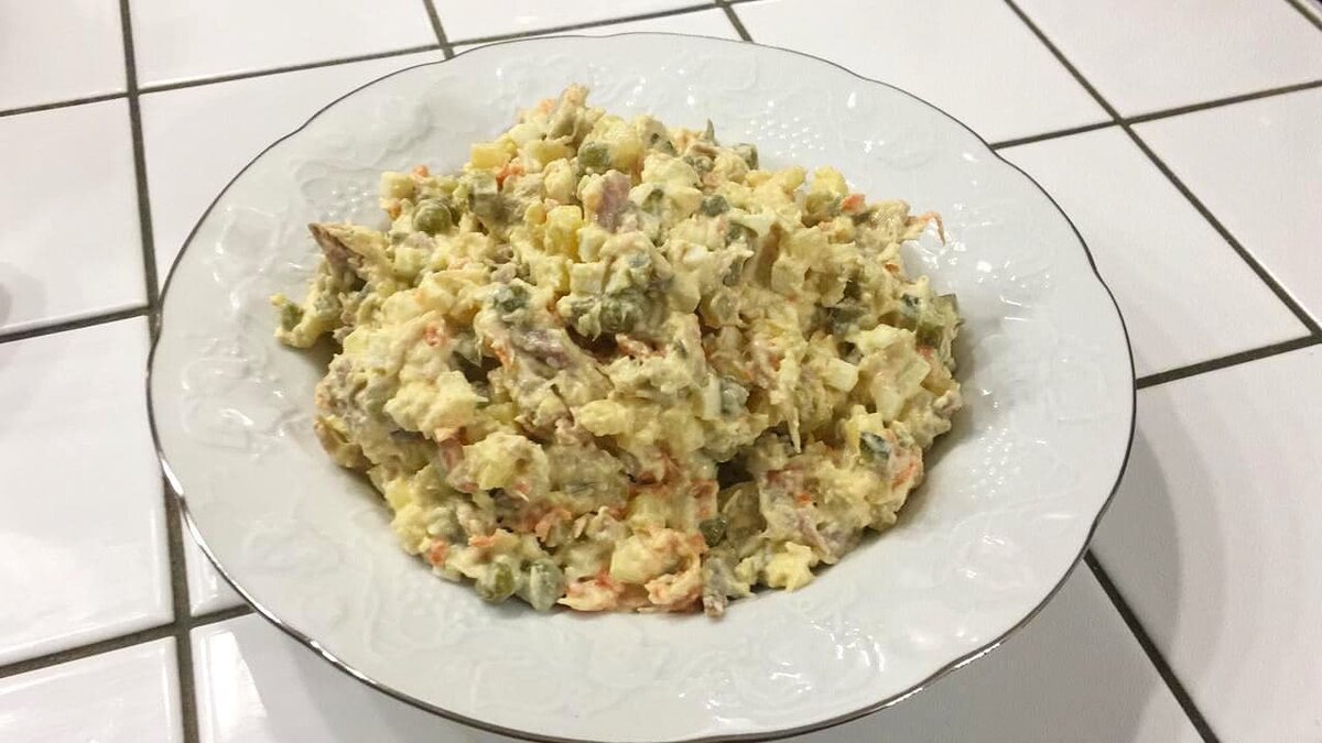 Горошек туда тоже, разумеется, консервированный и майонез.