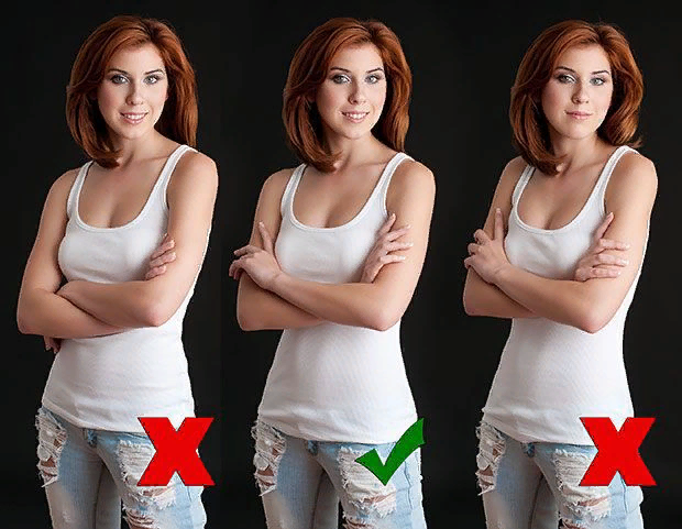 Оптимальным решением будет непринужденное скрещивание рук. Попробуйте положить ладони на противоположные руки чуть выше локтя. Кроме того, не забывайте о положении головы. Она не должна быть расслаблена. Следите, чтобы подбородок был немного приподнят, а шея - вытянута вверх. Эта маленькая хитрость сделает черты вашего лица более утонченными. Главное, не забудьте украсить лицо вашей неповторимой улыбкой. Получилось? Отлично.