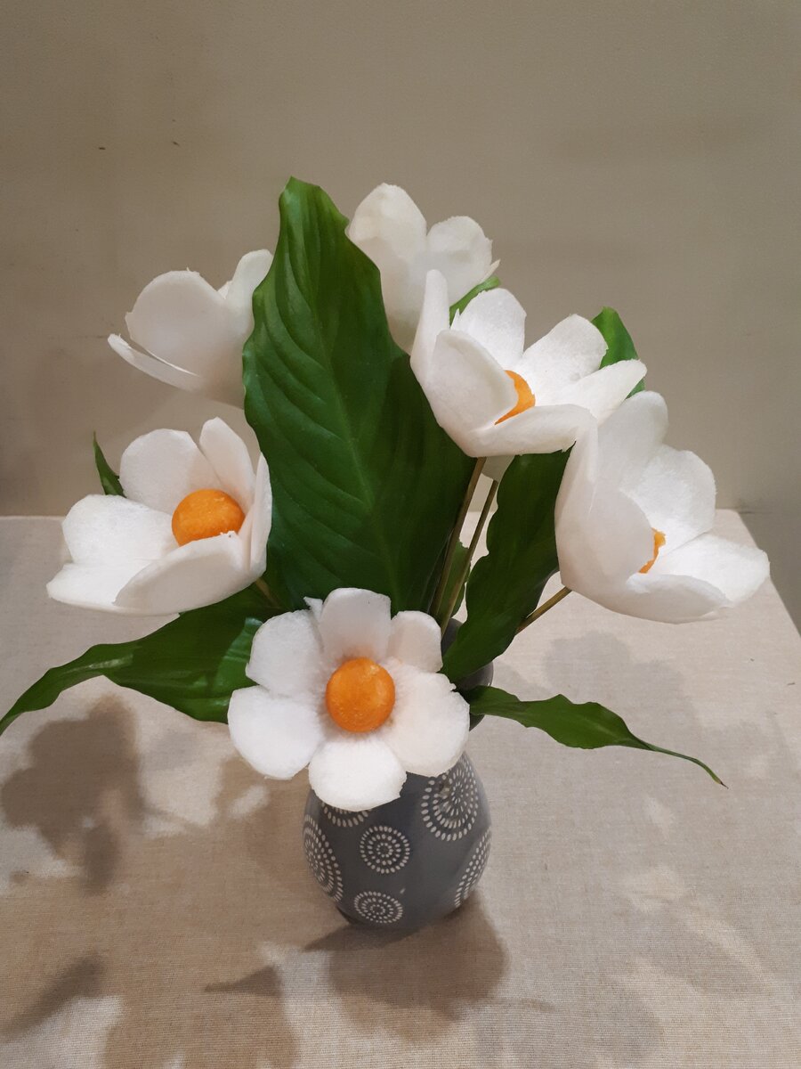 Этот же букет поставила в самодельную вазу, вазу сделала из картонной молочной пачки. Верхнюю часть отрезала, приклеила салфетку и ваза готова.