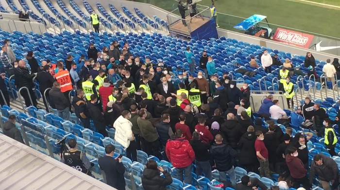 Как сообщает журналист Сергей Егоров, по неизвестным причинам в одном секторе «Газпром Арены» оказались фанаты обоих клубов.