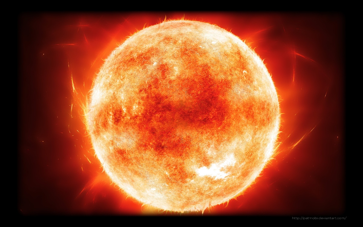 Как и все остальные звезды, Солнце представляет собой гигантский шар из раскаленного газа. В середине находится раскаленное ядро, где вырабатывается энергия, заставляющая Солнце светить. Температура ядра составляет 15 млн °C. Поверхность Солнца холоднее - "всего-навсего" 6000°C