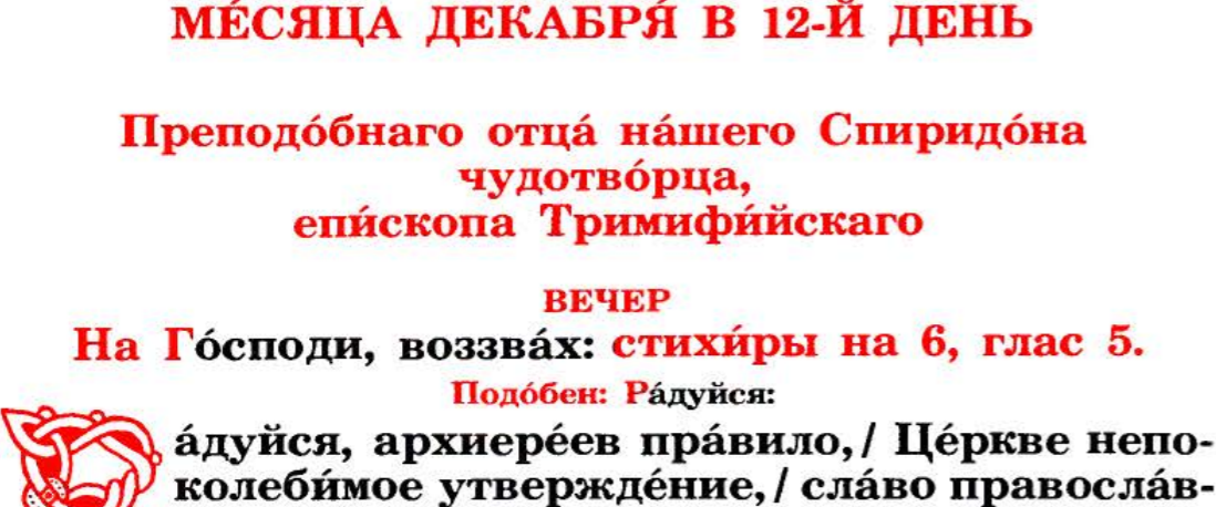 Давайте рассмотрим последование службы свт. Спиридону. Если под руками нет "зеленой" минеи, текст можно взять отсюда (копия в pdf) или отсюда (текстовый формат). Я буду ссылаться на первый вариант.