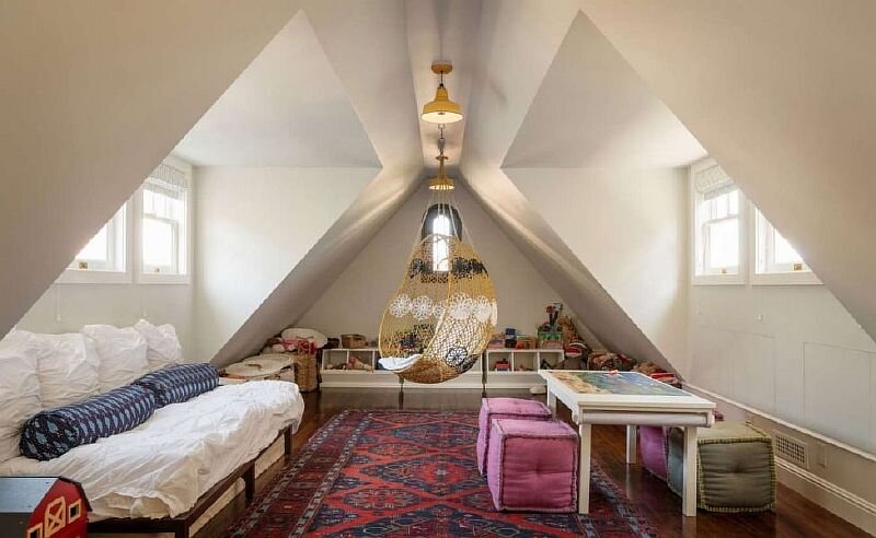 В настоящее время существует множество предложений относительно искусственных источников освещения. Это могут быть трековые шинопроводы, подвесные люстры, бра, торшеры, прожекторы, споты и т.д. Их выбор должен учитывать существующий естественный свет. Идеально, если прочность конструкции позволит выполнить в наклонной поверхности еще одно, а, может быть, и несколько окон. Дополнительные проемы позволят создать не только лучшее освещение, но и визуально сделать пространство шире. Здесь необходимо учитывать и климатические особенности региона, в том числе осадки, которые вряд ли станут украшением потолка. Отдельно необходимо продумать используемую цветовую гамму. Специалисты рекомендуют отказаться от ярких оттенков. Идеальным считается помещение, оформленное в однотонных спокойных тонах. Это могут быть светло-серые или светло-коричневые оттенки. Правильное расположение трекового шинопровода для светильников, с отражением лучей света вдоль стен, позволит придать поверхностям более приятный, неназойливый вид. Добавим, что соответствующий прием не уместен разве что в ситуации со стилем лофт, где важно сохранять естественный свет и характерное состояние стен, перекрытий, их декор, текстуру строительного материала.