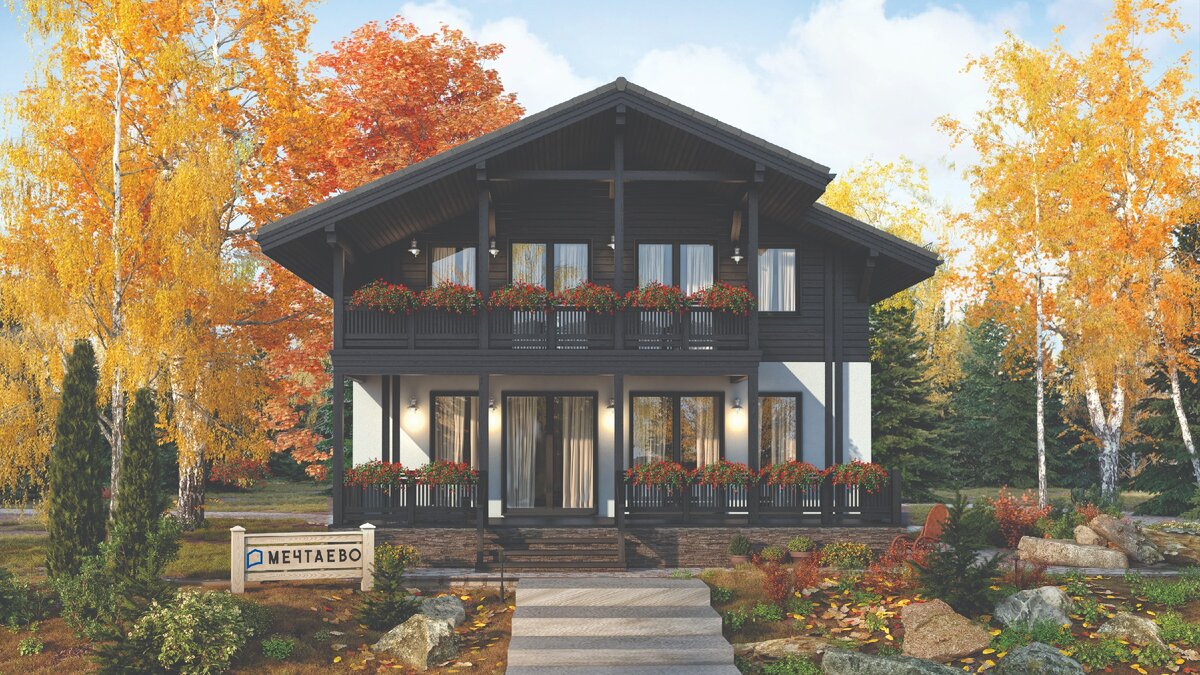 Дом выполнен в классическом стиле, и в стандартном проекте всё в нём играет на контрастах: двускатная крыша, дерево и камень на фасадах, чёрно-белая расцветка. Особое очарование каркасному коттеджу придаёт терраса, над которой разместился балкон.