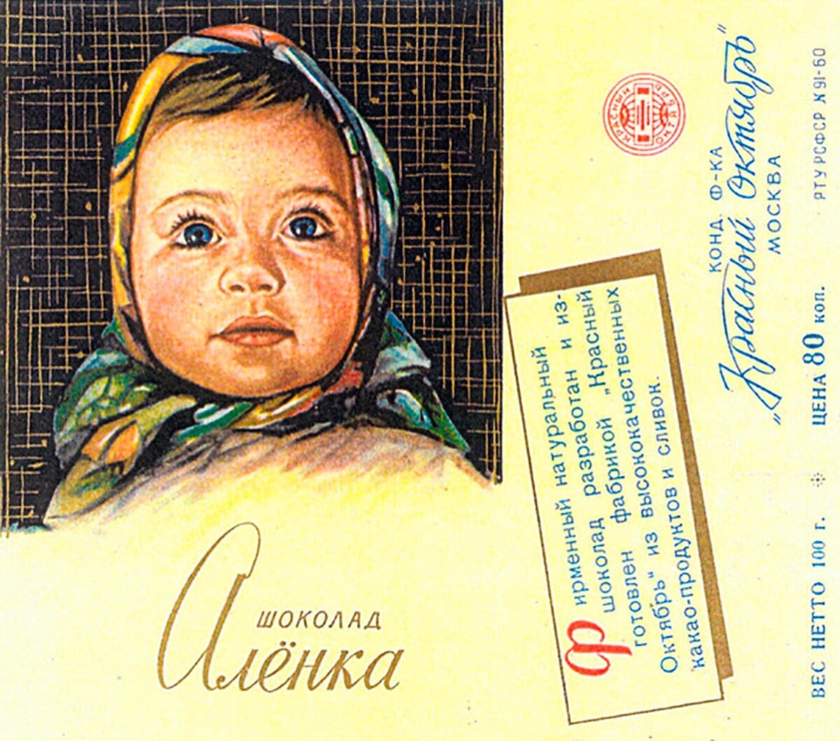 Название «Аленка» продукт получил сразу. Его назвали в честь Елены – дочери советских космонавтов Николаева и Терешковой. А вот с оберткой ясности не было, и каждая партия выходила с разными тематическими изображениями: к Первомаю, к 8 Марта и т.д.