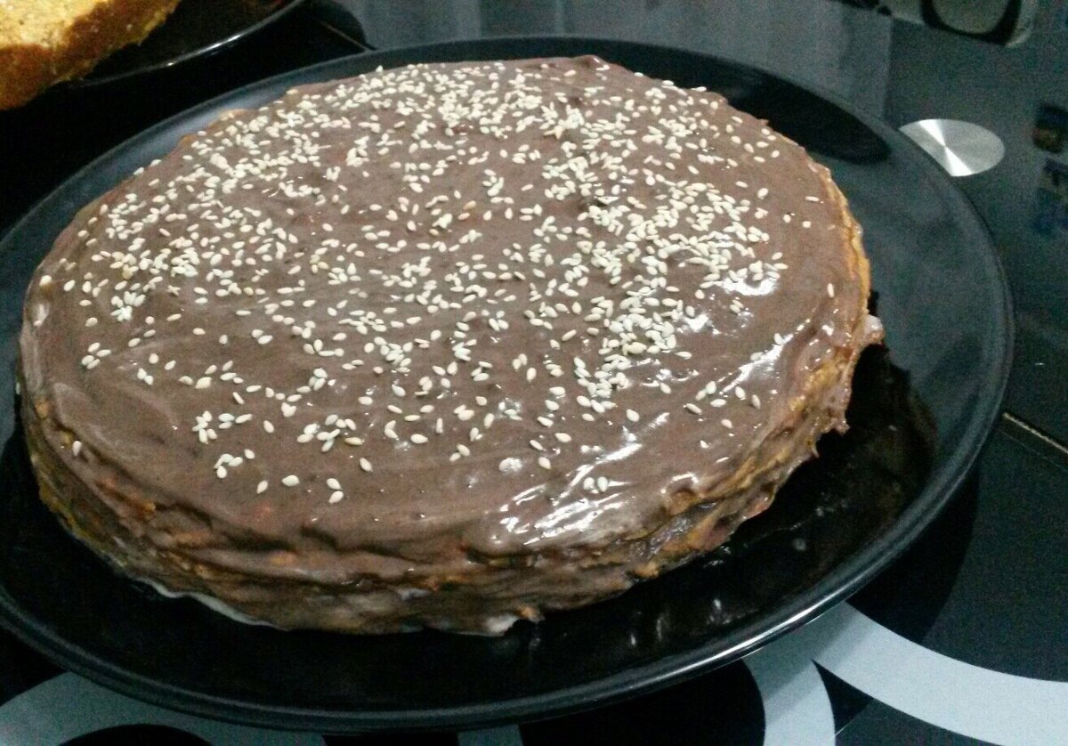 Пару средних коржей промазать кремом (Одна пачка творога 125г и сироп ).