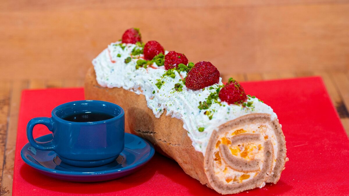 Приготовленный крем нанесите на рулет сверху, распределяя его равномерно, украшая поверх клубникой и посыпая молотыми фисташками. После этого уберите десерт в холодильник для пропитки еще на пару часов.