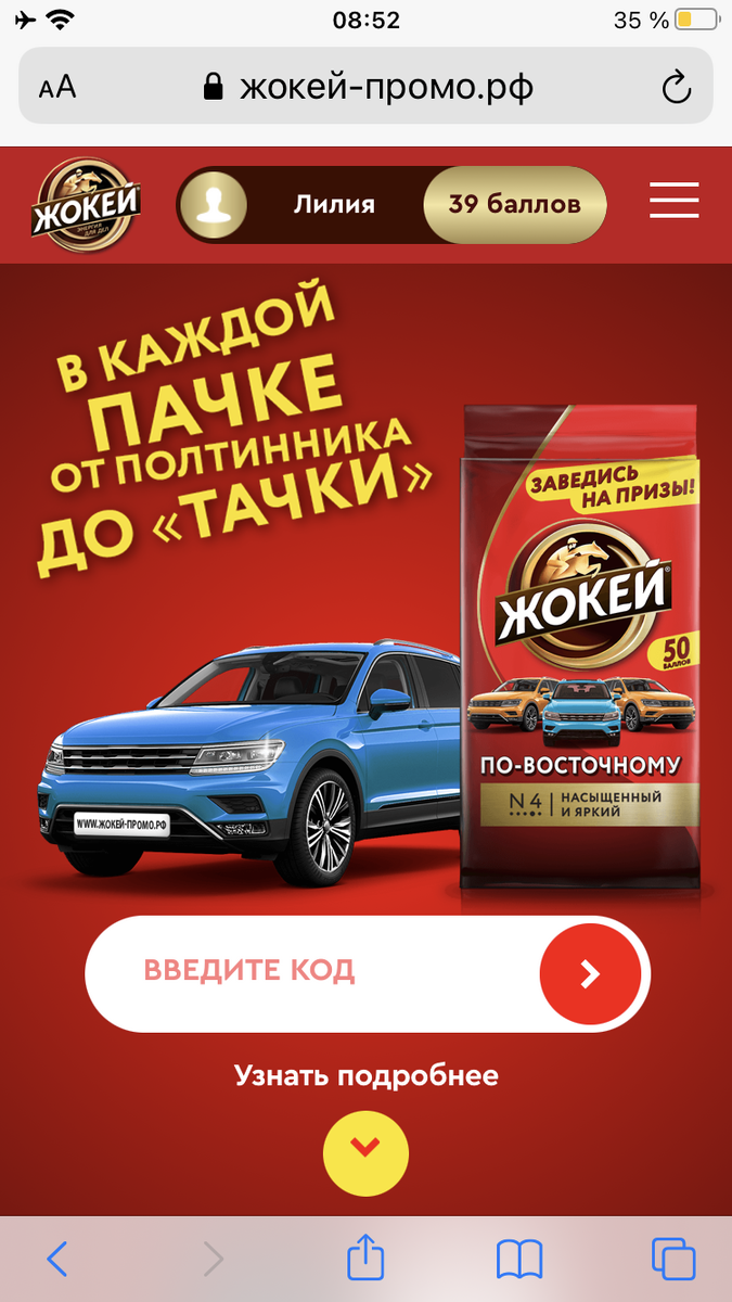 Купила я кофе Жокей и, обнаружив на пачке информацию об акции «В каждой пачке от полтинника до тачки» решила зарегистрировать код.