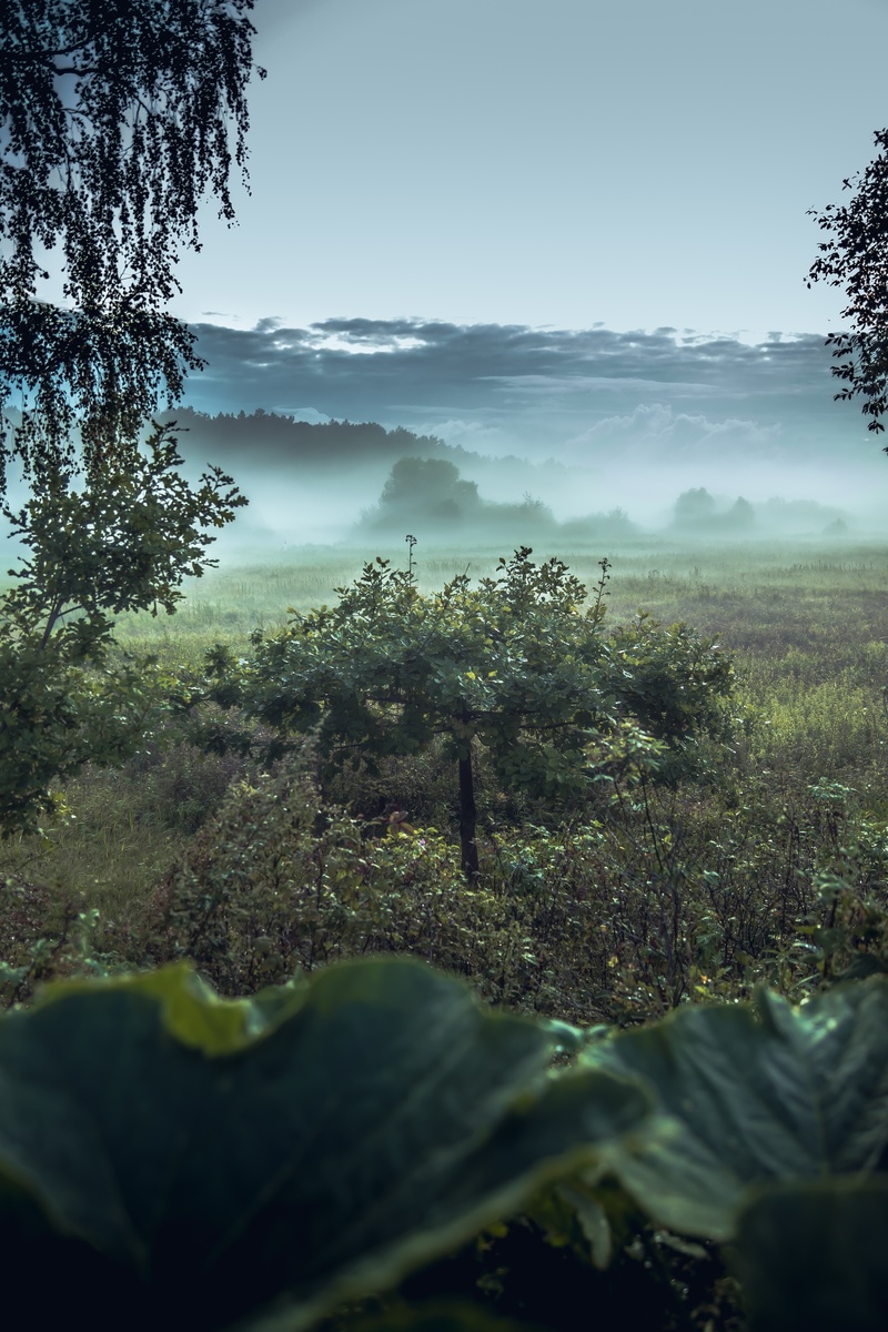 Буквально за час до заката со стороны реки начал появляться туман, он плавно приближался и в конце концов заполонил всё вокруг. А потом, с заходом солнца, он так же плавно растворился в пространстве..
