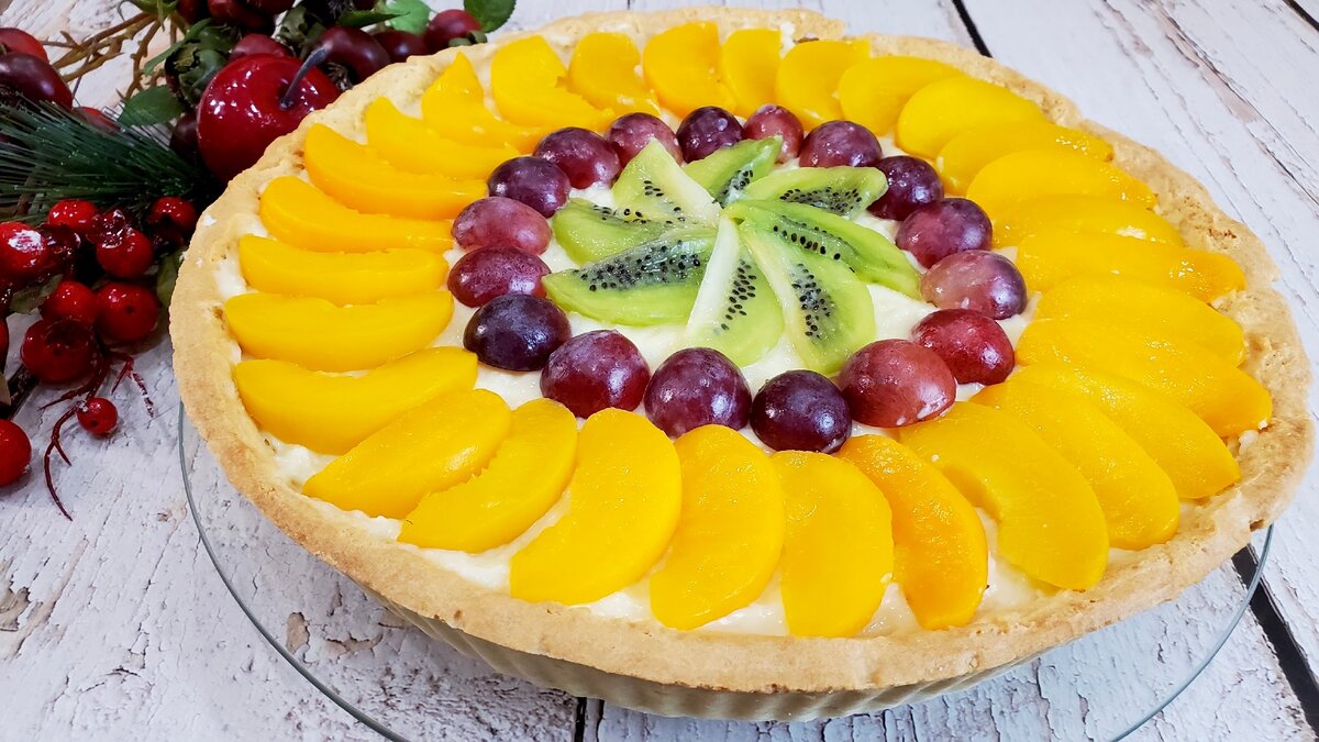 Песочное рассыпчатое тесто и нежный сливочно заварной крем. Сверху ваши любимые фрукты. Этот тарт можно приготовить за сутки до предполагаемого торжества. Приятного аппетита!