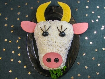 Тотемом нового года станет Белый Металлический Бык. Салат в форме этого символа разнообразит меню и вызовет интерес у гостей. Приготовить блюдо быстро и легко.