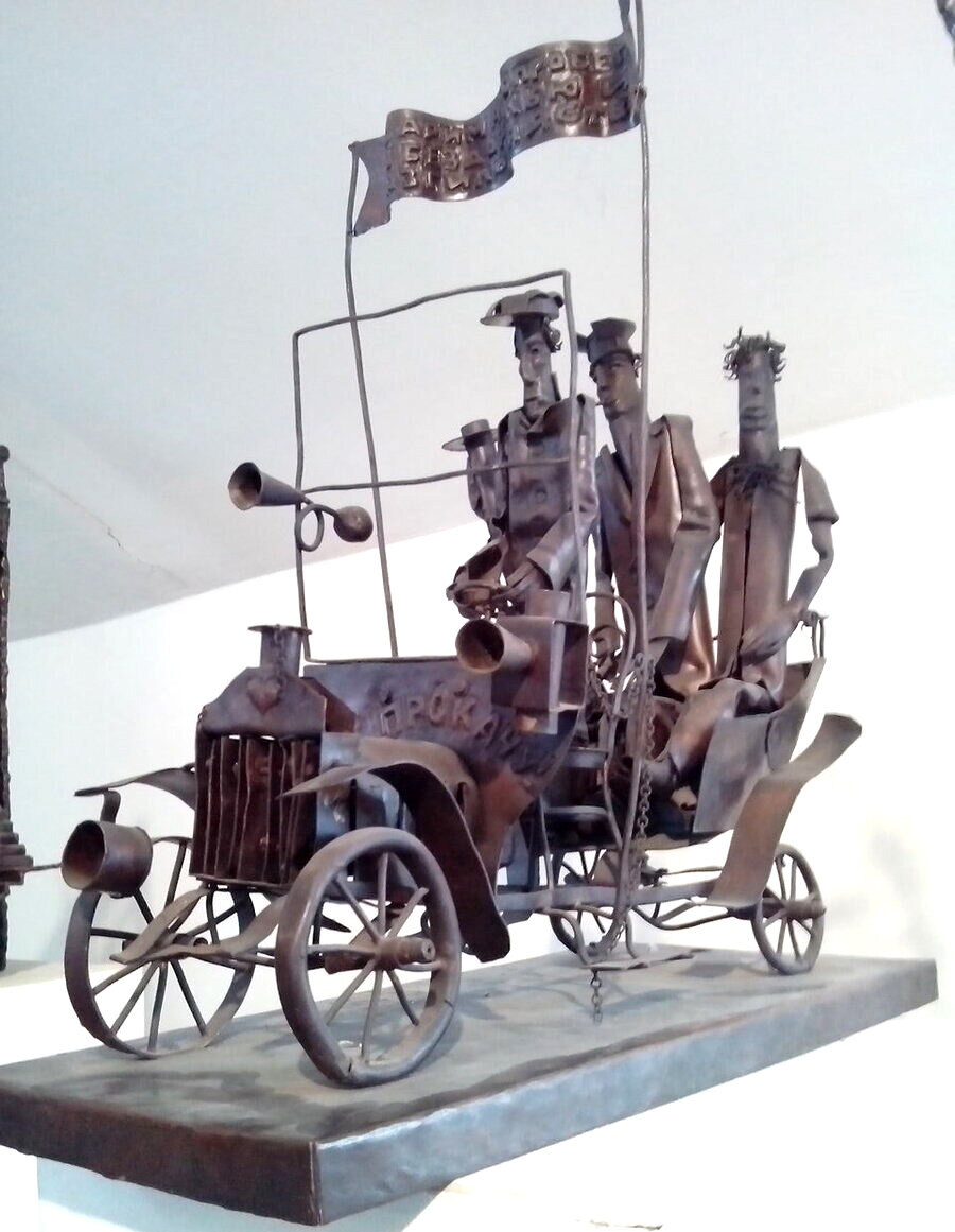 Что делать зимой? Самое время - отправиться снова в любимую Тарусу, заодно решили с друзьями по дороге заглянуть в гости к потрясающему скульптору по металлу Андрею Волкову. У Андрея есть телескоп, вечером можно любоваться на звездное небо. Начинаем осмотр работ. Много лет Андрей работает в очень оригинальном жанре - скульптура из металла. Многие выбирают мягкие, податливые материалы, но Андрей использует сварку железа. Ему нравится очень прочный характер обычного железа, а не податливость меди или бронзы, которые используются чаще, и это позволяет ему делать потрясающие жанровые работы: Много лет Андрей дружит с замечательным художником, мастером офорта из Протвино, Виталием Губаревым. На канале уже выложена моя интереснейшая беседа с одним из ведущих графиков России. А мы смотрим дальше - одна из моих любимых работ! Некоторые работы снабжены приводом - и вертятся, когда крутишь ручку. Аннушка уже разлила масло: Людмила, из нашей компании - фоткает с удовольствием! ))) Беседуем