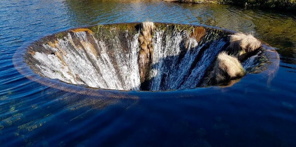 Продырявленное озеро Кончос в Португалии – это творение человеческих рук. Гигантская воронка – это гениально устроенный шахтный водосброс. Полуторакилометровый тоннель соединяет два озера – Кончос и Лагоа Комприда. А огромная дыра, в которую уходит вода, – приемный резервуар, диаметр которого составляет 48 м, а глубина – 4,6 м.