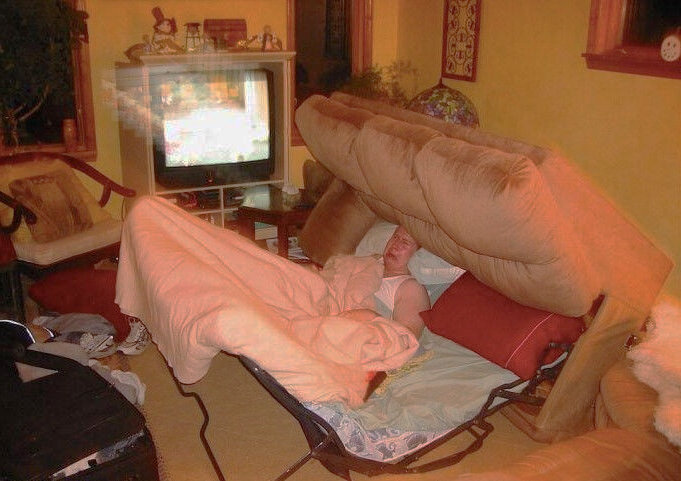 Бедный мужик. Жена, небось, прогнала с постели на диван. У меня самого такое было. Но диван так не ломался. А фотка получилась очень смешная.