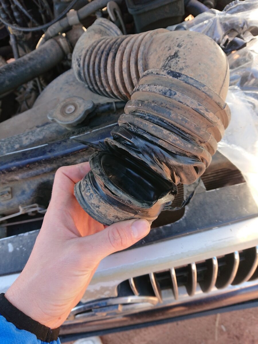 Который соединяет дроссель и датчик массового расхода воздуха (ДМРВ). Дело в том что в этом патрубке есть одна фишка , выходит из строя он очень редко при чем какие образом, либо где то сами можете рвануть, либо проткнуть отверткой или еще чем , либо где то не аккуратный изгиб, то есть любой тычок , образует лишний подсос воздуха, который соответственно будет обходить сам ДМРВ. Определить то что воздушный патрубок испорчен можно по тахометру , либо по свечам зажигания , они будут черные. Будьте внимательны так как чек при этом не загорается .