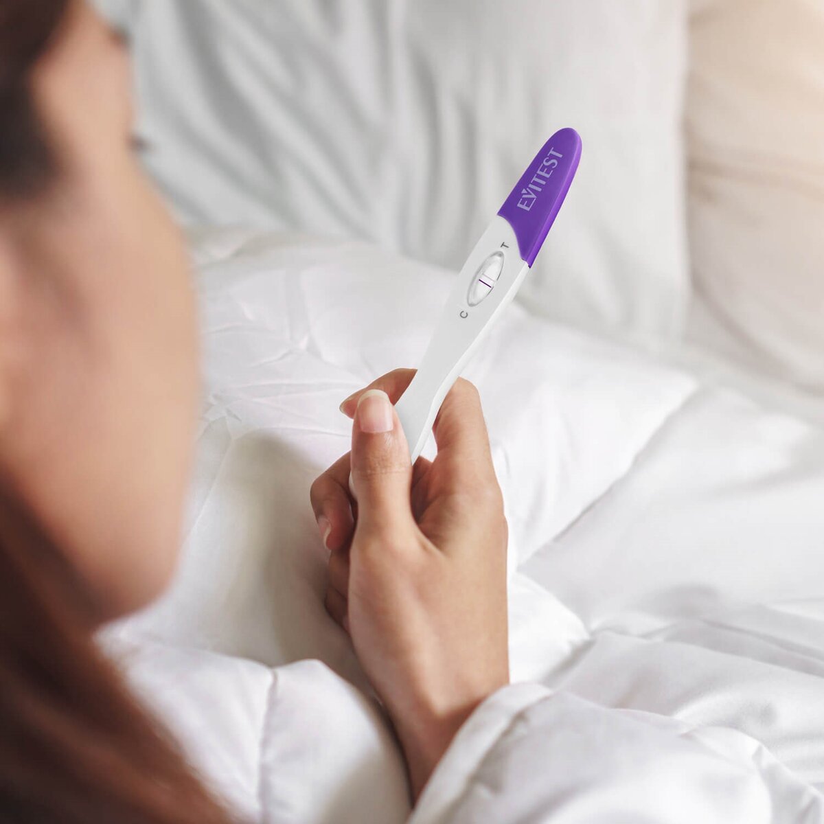 Чтобы определить беременность уже с первого дня задержки менструации, проведите домашнее тестирование с экспресс-тестами на беременность Evitest.