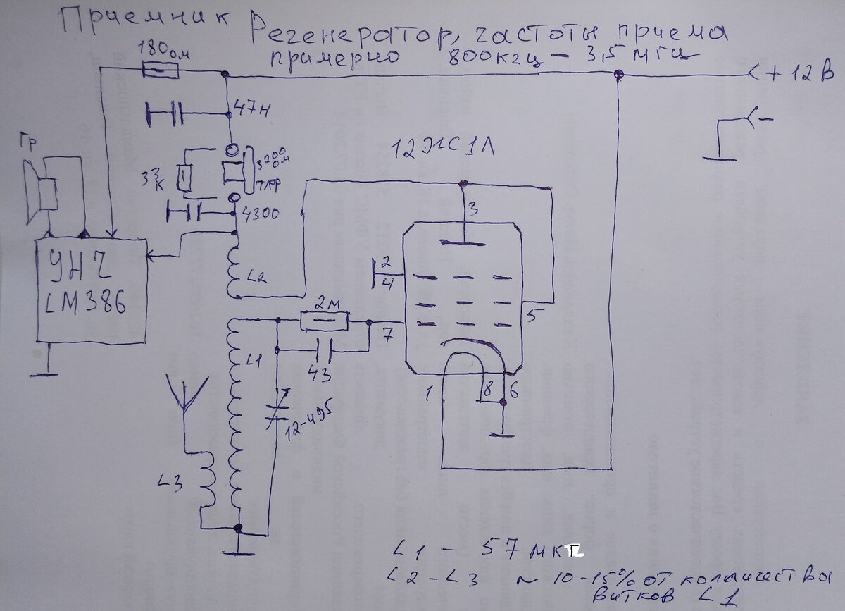 Регенеративный приемник на радиолампе 12Ж1Л, с питанием 12 вольт