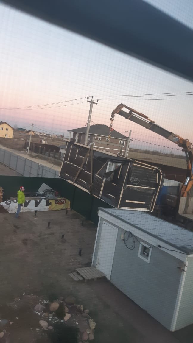 Идеальный вариант транспортировки и разгрузки проиллюстрирован на фото: чудесная баня, чудесная дорога, чудесный участок. Поставили баню быстро, аккуратно и без накладок. Даже забор не пришлось демонтировать. Всегда бы так: