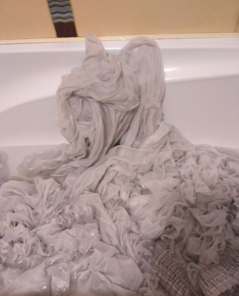 После того, как время прошло, хорошо теребим ткань, спускаем воду и слегка споласкиваем под теплой проточной водой.