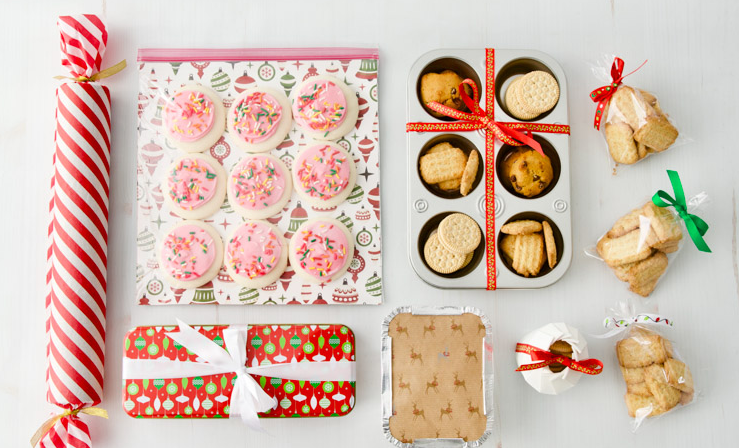 Одноразовая посуда из фольги тоже станет отличной упаковкой для печенья. Поместите внутрь угощенье. Картонку, которая идет в комплекте в качестве крышки, задекорируйте новогодней бумагой и скотчем. Подарок готов.