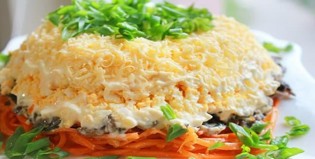 - Все отварить. Салат выкладывать слоями: 1 слой — картофель, натертый на терке и слегка посоленный; 2 слой — мелко нарезанная курица; 3 слой — обжаренный с шампиньонами лук; 4 слой — натертая на терке вареная морковь; 5 слой — натертые на мелкой терке белки; 6 слой — натертые на терке желтки.