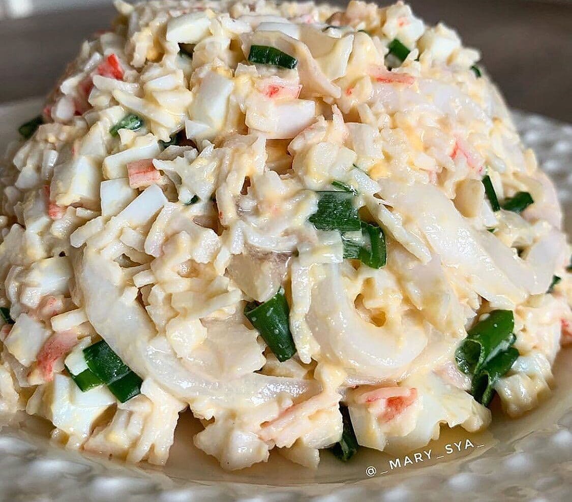 Кальмары, крабовые палочки, зелёный лук - нарезать. Я кальмары нарезала кольцами. Мне так больше нравится.