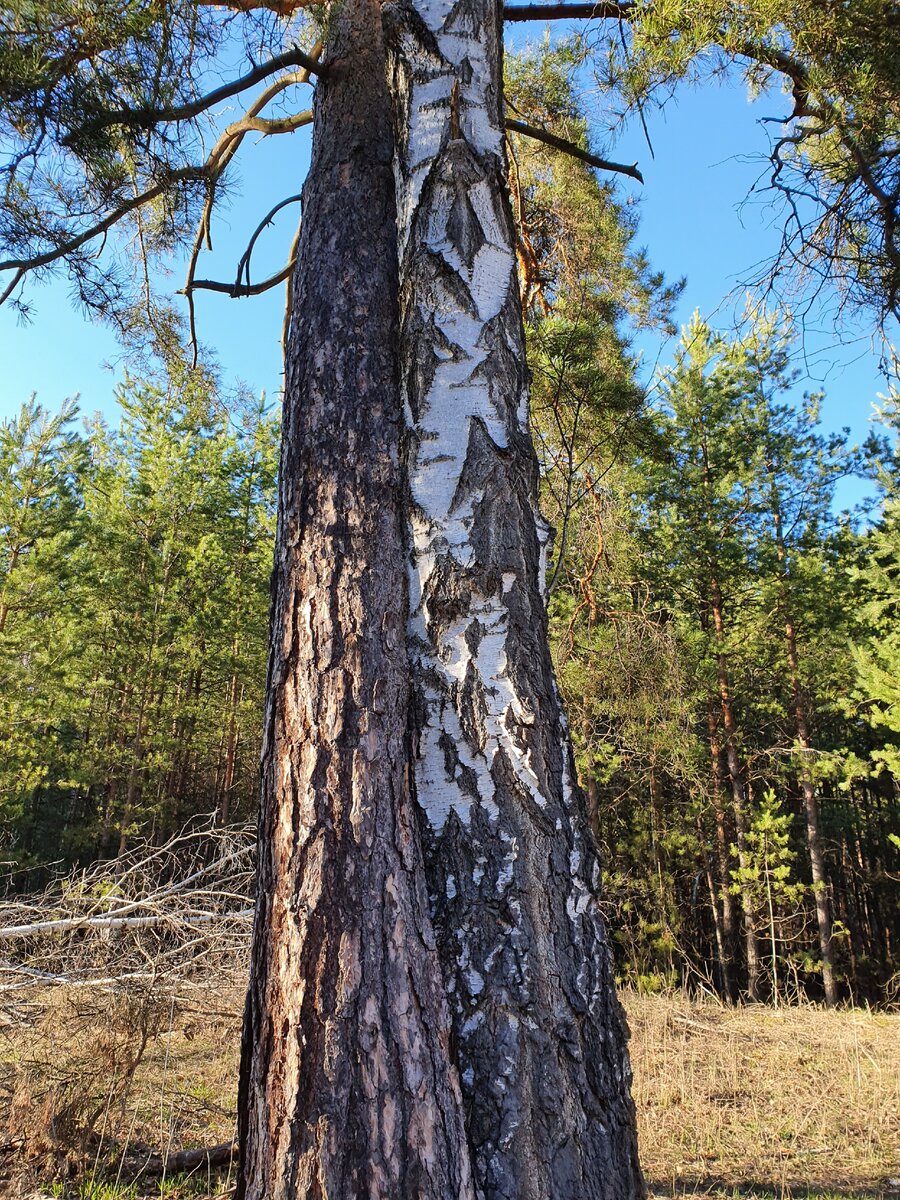 Гуляя по лесу в Рамони я столкнулся с необычным явлением. Срослись между собой два дерева разных пород: берёза и сосна. Как такое возможно?