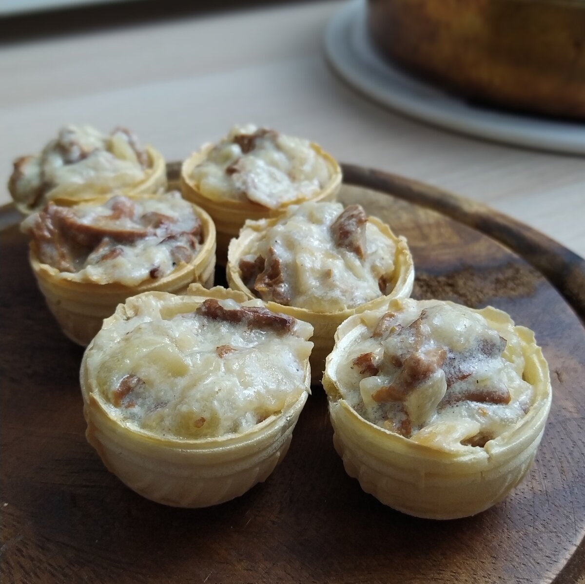 Остывшую смесь выкладываем на тарталетки. У меня вафельные, но можно использовать тарталетки из магазина любого состава.