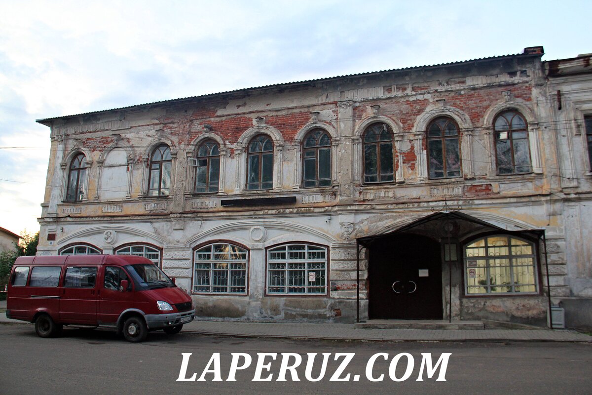 Далее по улице Ушакова мы двинулись к центру города, к бывшей Спасской площади (в советское время её переименовали в честь вождя мировой революции). Здесь, кстати, режиссёр Леонид Гайдай снимал фильм «Двенадцать стульев» — в кадр попала каланча. Самое высокое здание в Романове (25 метров) построили в начале XX века. В дореволюционное время на каланче в случае сильных морозов вывешивали белый флаг, сигнализирующий, что занятия для учеников отменяются. Рядом с ней практически руинированное строение — склады Строганова.