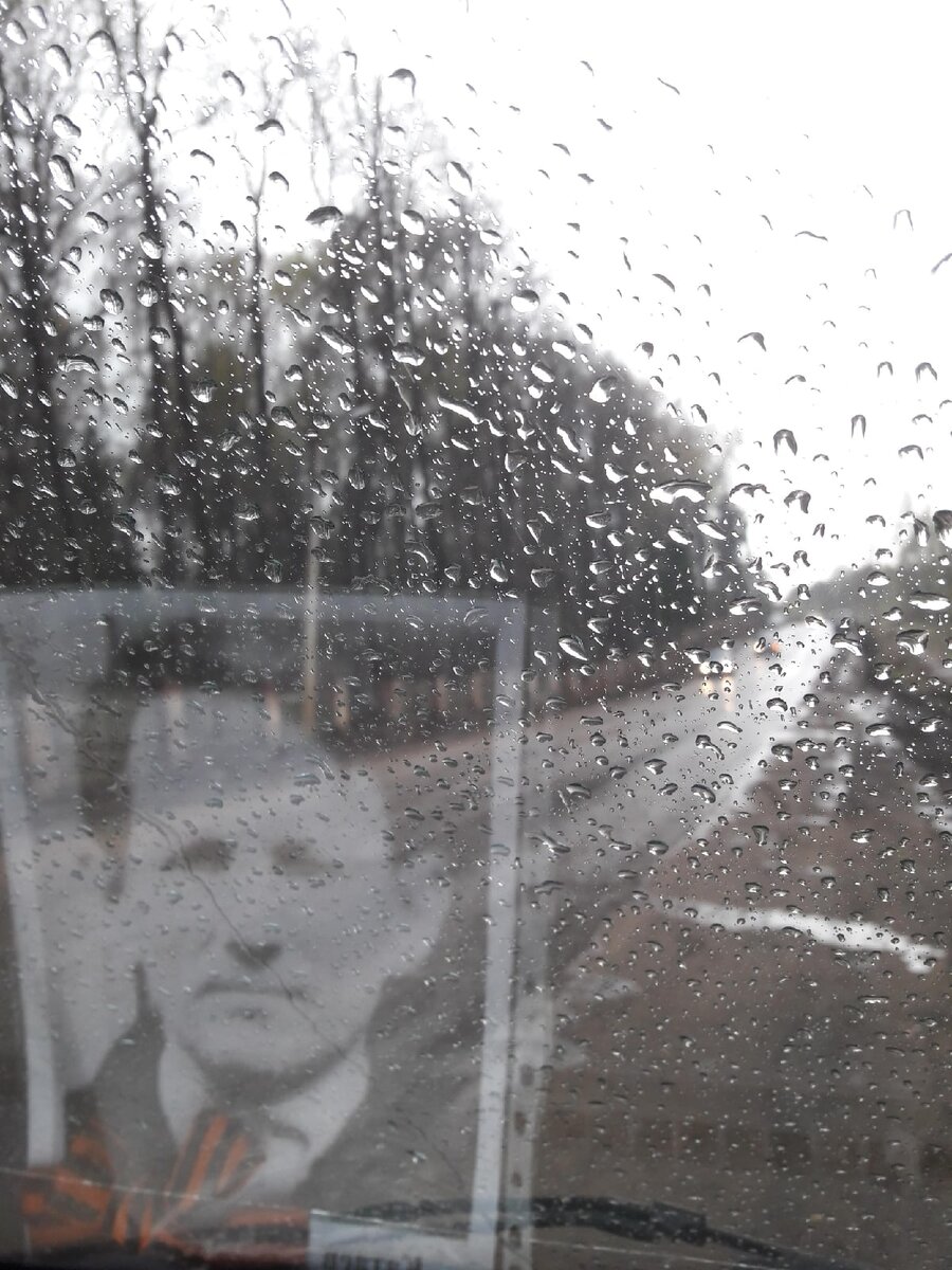 Конечно, никакой мистики в этом не было. Портрет Алексея Ильича, приготовленный к Бессмертному полку, лежал на панели и когда дождь усилился, отражение появилось в стекле...