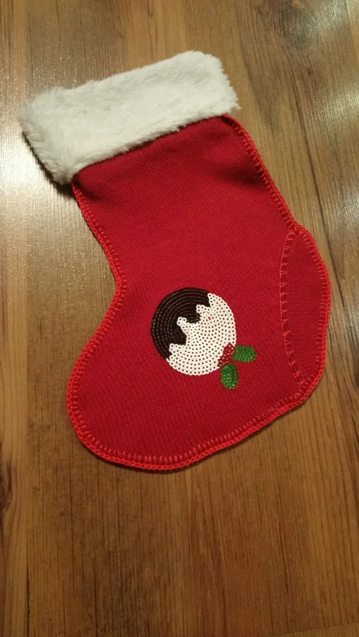 Итак, шла я в секонд-хенд конкретно за красным трикотажем, а нашла даже вот с такими украшениями! Теперь у меня есть кофта на которой пайетками вышито 5 елочных игрушек. Из них я решила сделать 4 рождественских носочка.