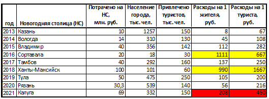 Ниже представлена табличка, в которой собраны новогодние столицы, начиная с Казани в хронологическом порядке и их траты на организацию праздничных мероприятий.