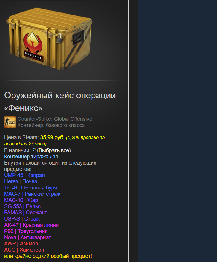Речь идёт о сундуке Феникс (Phoenix), который вышел в 2014 году и содержит в себе такие популярные скины как AK-47 | Красная линия или легендарное AWP | Азимов.