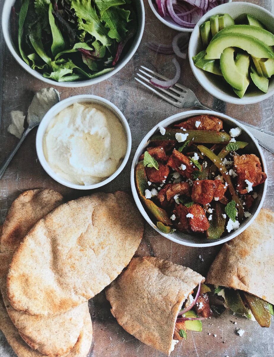 Нам понадобятся 500 грамм мякоти баранины, 4 питы, 2 зеленых болгарских перца, 1 авокадо, красная луковица, 50 грамм сыра феты, чайная ложка тмина, мята, оливковое масло, хумус, листья салата, паприка и соль по вкусу.