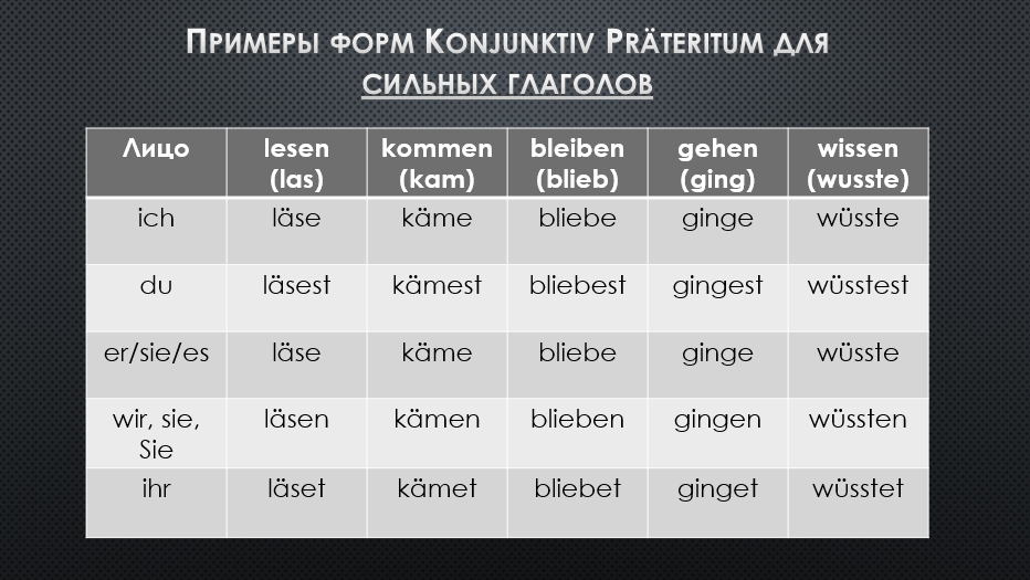 Например, глаголы machen и arbeiten в сослагательном наклонении для 1 и 3 лица ед.ч. получат уже знакомый нам вид machte/arbeitete.