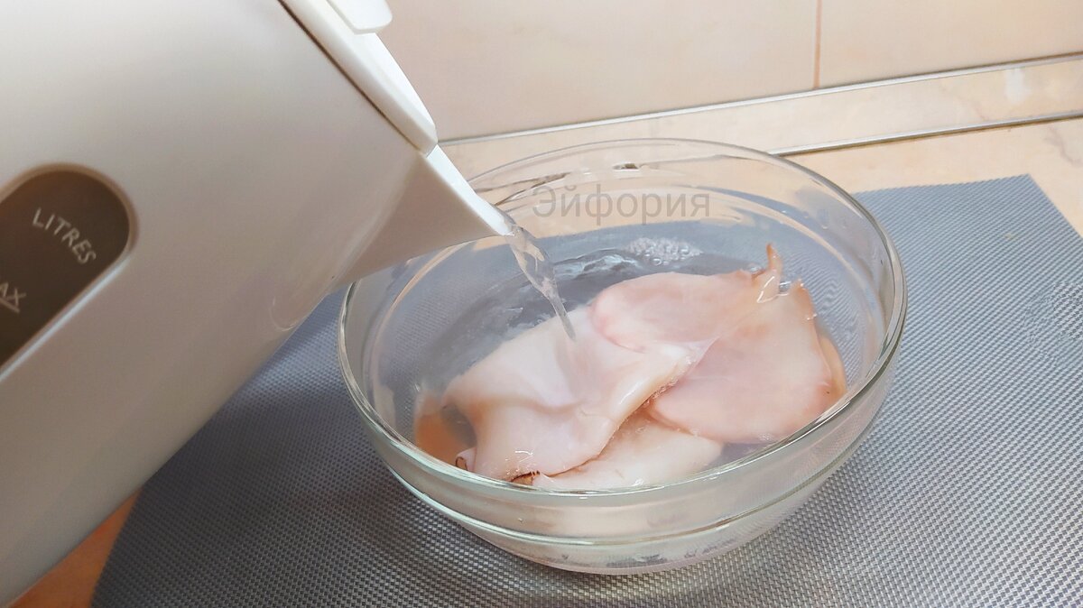 Укладываю в миску, заливаю крутым кипятком и оставляю на две минуты - не больше. Таким способом кальмарчики очень легко чистятся, принимают правильную форму и в готовом блюде не станут резиновой подошвой.