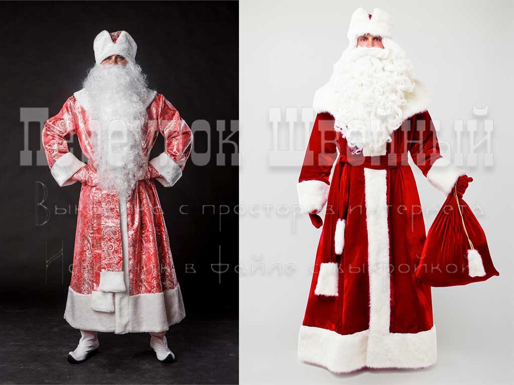 Выкройка шубы Деда Мороза с запахом и поясом по образцу халата. Подклада на выкройке нет. Его можно подкроить самостоятельно. Шьем костюм деда мороза из ярких нарядных тканей: атлас, бархат, жаккардовый мех, стеганные варианты тех де тканей. На отделку белый мех. Толщину материалов выбирайте исходя из назначения шубы. Будет ли она применяться, как верхняя одежда на улице, или легкий вариант для
