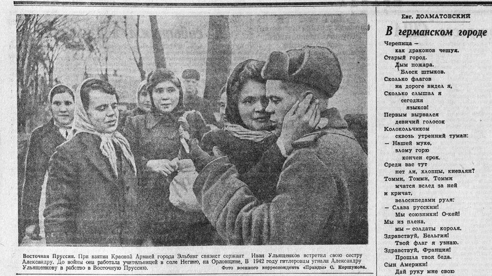 Этот снимок сделан в марте 1945 года. Военкор Сергей Коршунов запечатлел радостный момент – встречу сестры с братом, освободившим ее из фашистской неволи. Фото вскоре опубликовали в газете «Правда», а затем в информационном бюллетене посольства СССР в США.