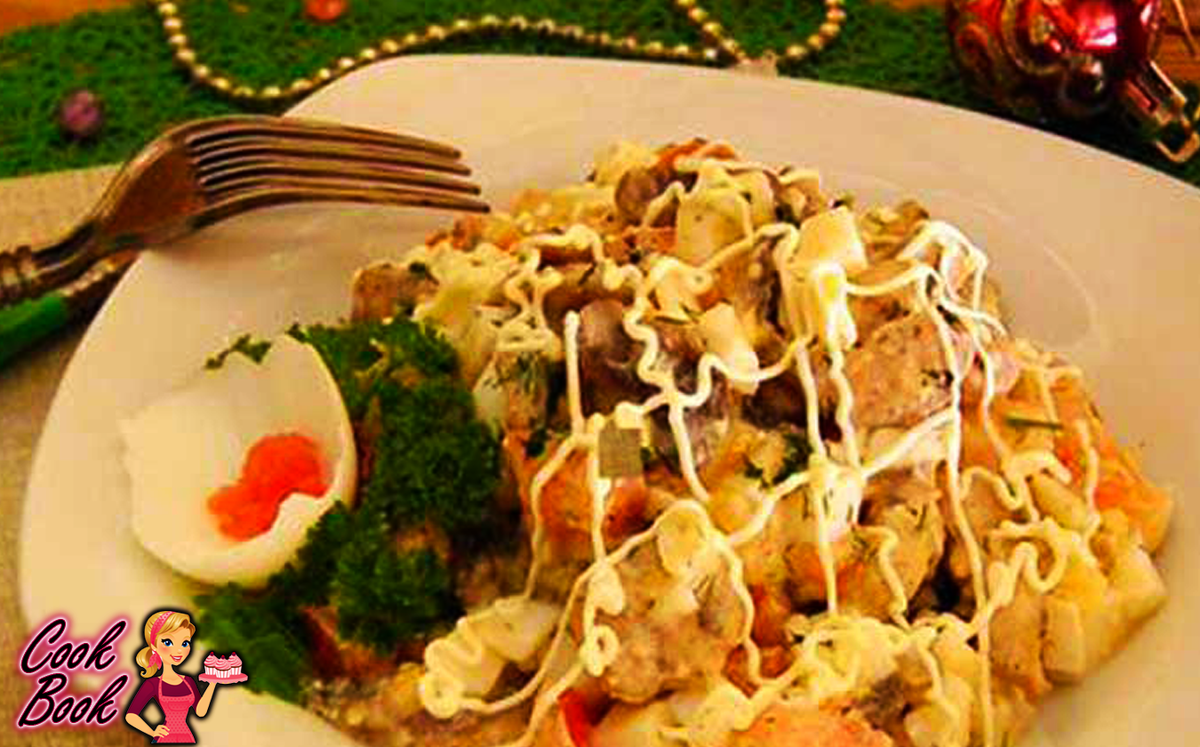 6. В салатнике смешиваем все ингредиенты6 помидоры, яйца, курица, лук и грибы. Добавляем майонез, зелень, соль и перец по вкусу.