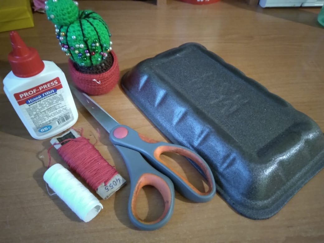Итак, что нам понадобится. Нам нужен кусочек пенопласта, или такая одноразовая тарелочка, как у нас на фото, клей ПВА, нитки, ножницы и иголочки.