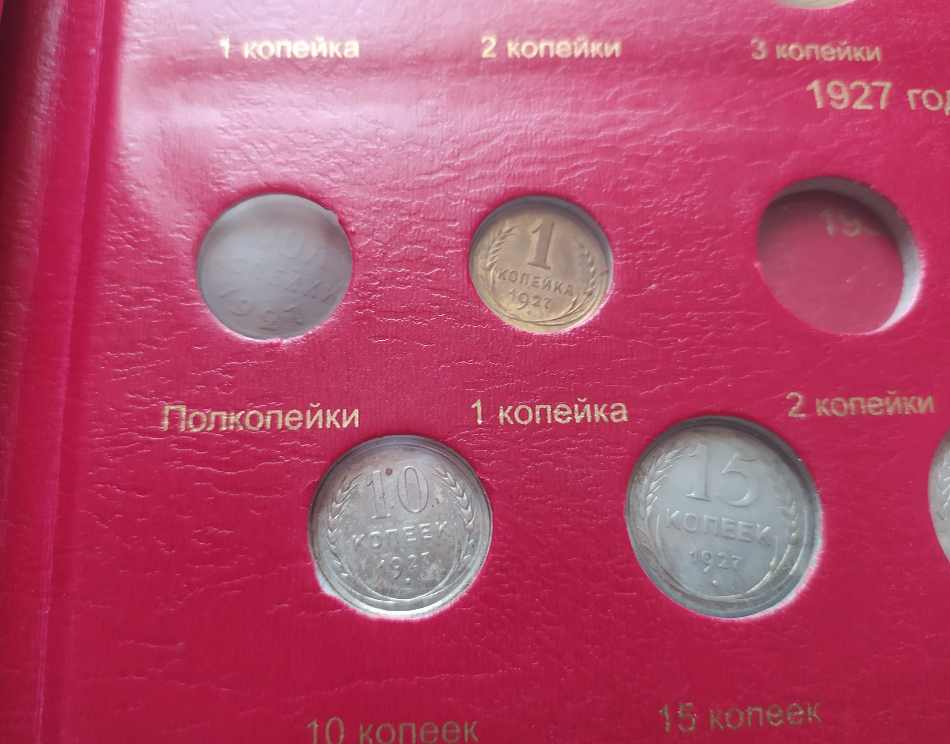 Значит, монет в полкопейки было много, и много их было потеряно. А может быть и теряли так запросто, что не знали, куда их можно было приспособить? В 1926 году уже чеканили монеты маленького номинала из бронзы, которые были более удобны для повседневных нужд. Вот, сравните размеры полкопеечника и копейки: