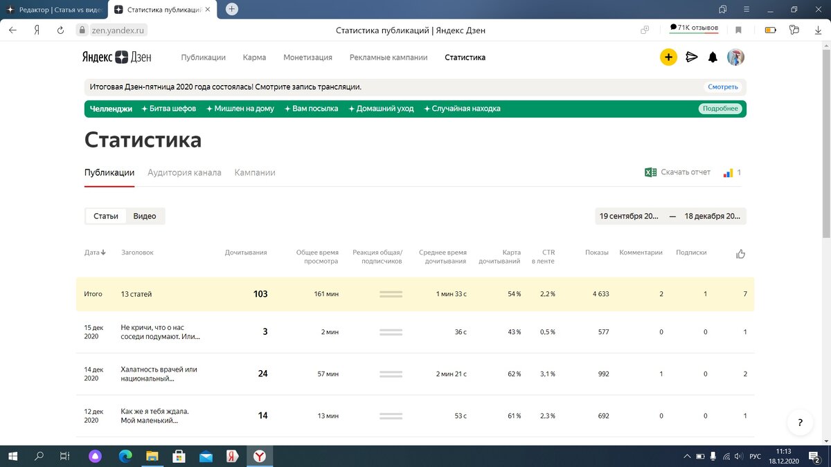 На данный момент у меня на канале 24 публикации. Первая была сделана 20 ноября. Из них 13 статей и 11 видео. Читала мнение, что с помощью видео можно очень быстро набрать необходимые 10 000 минут просмотра. Решила попробовать. Конечно первое мое видео "не о чем" было для меня настоящим прорывом - получило 2598 показов и 895 просмотров. Это в общей сложности составило 362 минуты просмотров.
