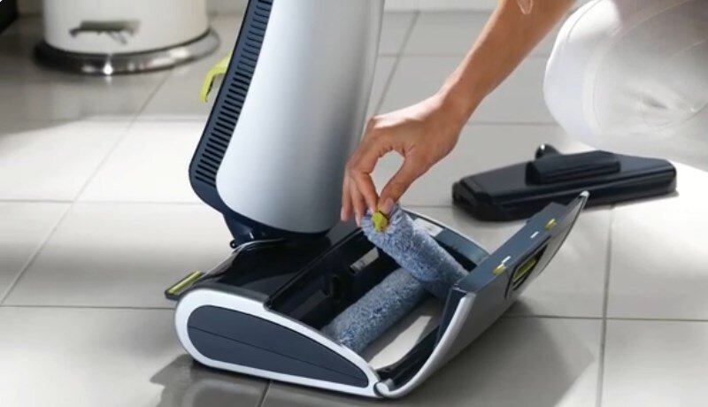 Принцип работы инструмента прост. В рабочей части (которая передвигается по полу на колесиках) есть специальная щетка. Она начинает вращаться, как только вы включаете прибор. Источник питания - аккумулятор, кнопка включения находится на корпусе, поэтому очень удобно нажимать ногой.