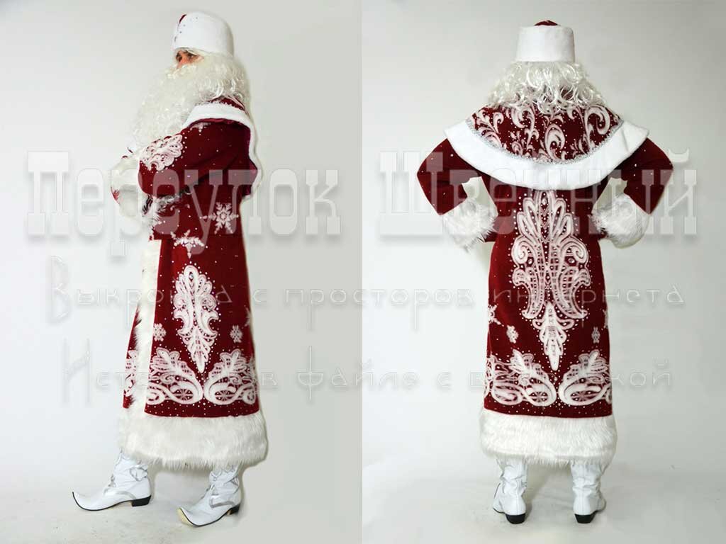 Выкройка шубы Деда Мороза с воротником пелериной и стойкой. Застежка планка. Основная ткань и отделочный мех комбинируются на Ваше усмотрение. Шить можно, как с подкладом (Подкраивается по основной выкройке, так и без. Материалы могут быть самые разнообразные. Самые распространенные: жаккардовый и ли просто тонкий мех, бархат, парча, сатин или плотный атлас, велюр.